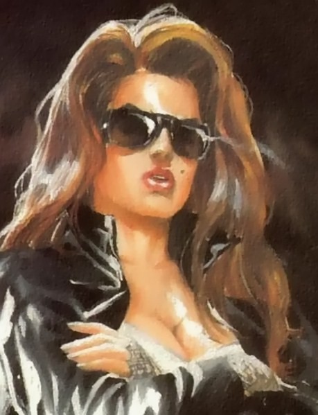 Aurora Model,[1] Test Number 808,[2] was a Terminator that appeared as a Caucasian female with seductive pink lips and a dark beauty spot on her left cheek and long wavy brown hair flowing to the middle of her back. She wore dark sunglasses, a mid-riff length black leather jacket with a white halter top beneath, skin tight black leather pants with high heeled thigh-high boots, fingerless fishnet gloves and a large belt with spikes (much like a gruesome dog collar on a colossal scale).