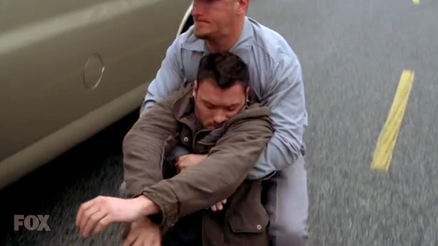 Derek and Cameron drive down a street, away from the storehouse. A car stealthily gets on their tail, then suddenly one of their tyres blows. Only now do they notice the following truck, which has suspiciously stopped at the end of the road and Derek decides to investigate. However, he is tazered and captured. Cameron chases after the truck, managing to shoot one of the men and memorizing the truck's license. She catches up with the truck at a warehouse. The remaining attacker surprises her by dowsing her with water from above and then electrocuting her. Having received instructions from John Henry's "brother" on how to remove her chip, the assailant approaches her with a knife. But he takes too long, and Cameron reactivates and chokes the man, to then proceed to freeing Derek. Upon his inquiry, she explains her reason for coming after Derek was to protect John, as Derek knows the location of the safe house. When Derek insists he would not have given up this information, she calmly accuses him of having done so before.