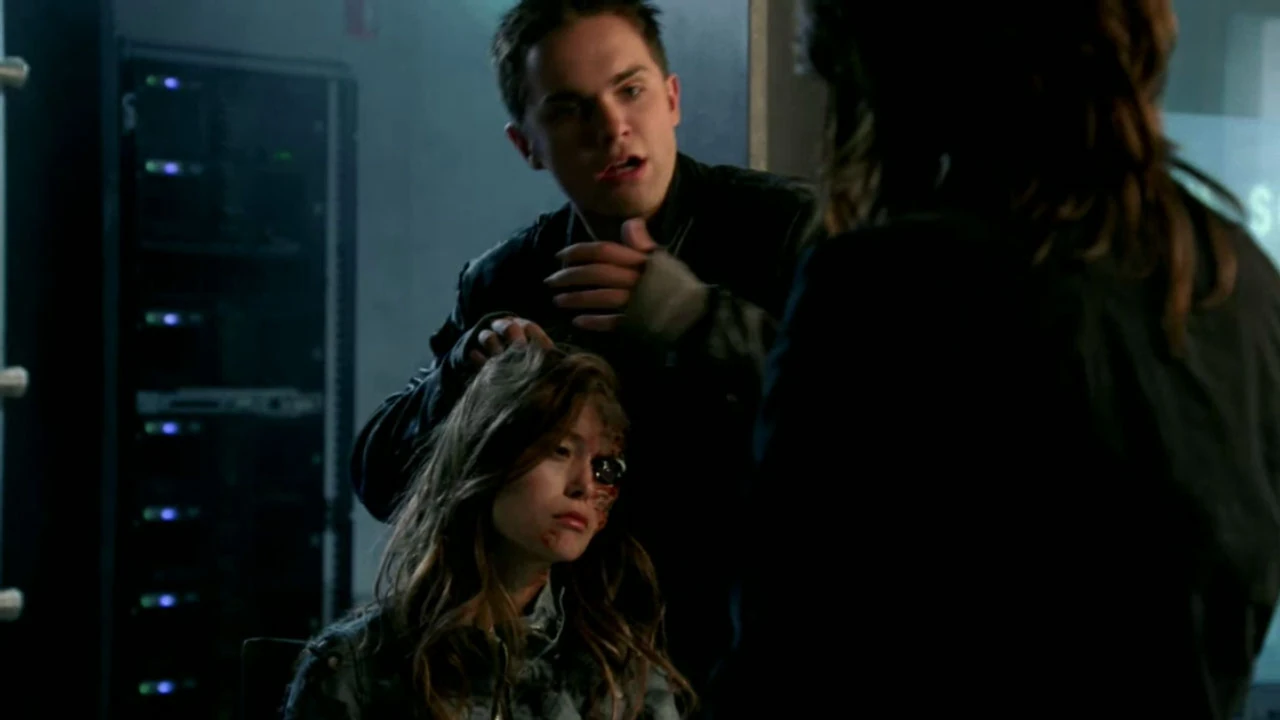 John insists that he rescues his mother but is denied by Cameron, refusing to let him risk his life. He then asks for a laptop to research if unshielded nuclear power sources can cause cancer. They are later visited by Chola with fake IDs and a message from Sarah to not come rescue her. Afterward, Ellison comes, informing them of Weaver's desire to meet with them. However, John refuses to do so without Sarah.