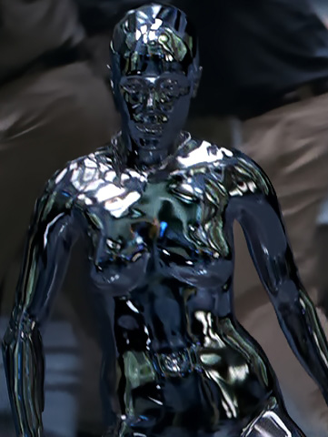 Like the T-1000, the T-X utilizes mimetic polyalloy to impersonate humans. However, whereas the T-1000 was constructed entirely from this liquid metal, the Model T-X only has a liquid metal outer sheath covering its endoskeleton for infiltration purposes, which gives the T-1000 an advantage for being able to regenerate better. Additionally, the T-X cannot not slide through narrow spaces as a T-1000 can. Like the T-1000, the T-X can impersonate any human it touches, typically terminating the subject upon assimilation. The T-X seems to be able to mimic targets it sees as well. For example, the T-X can increase its breast size as seen by a nearby billboard, effectively confusing an L.A. patrolman. Stored within small reservoirs in the cranial casing of the T-X when in endoskeletal form, the mimetic polyalloy not only aids in infiltration, but also adds strength to the overall armor of the Model T-X.